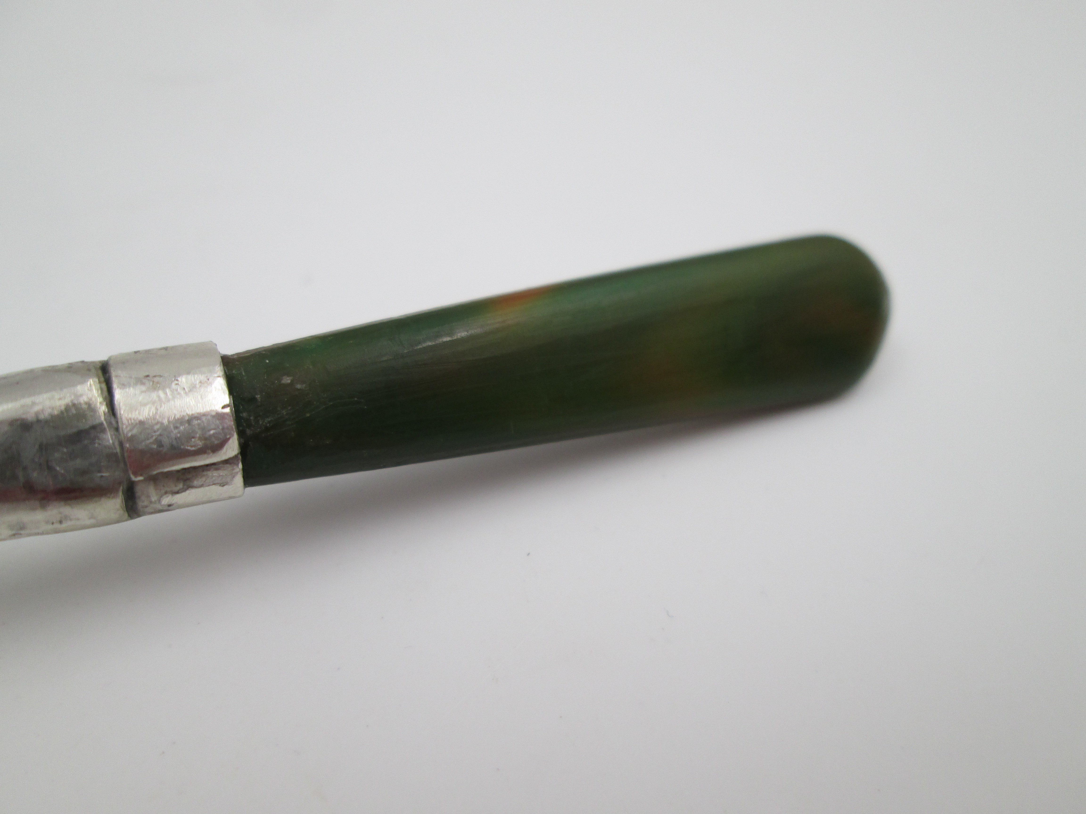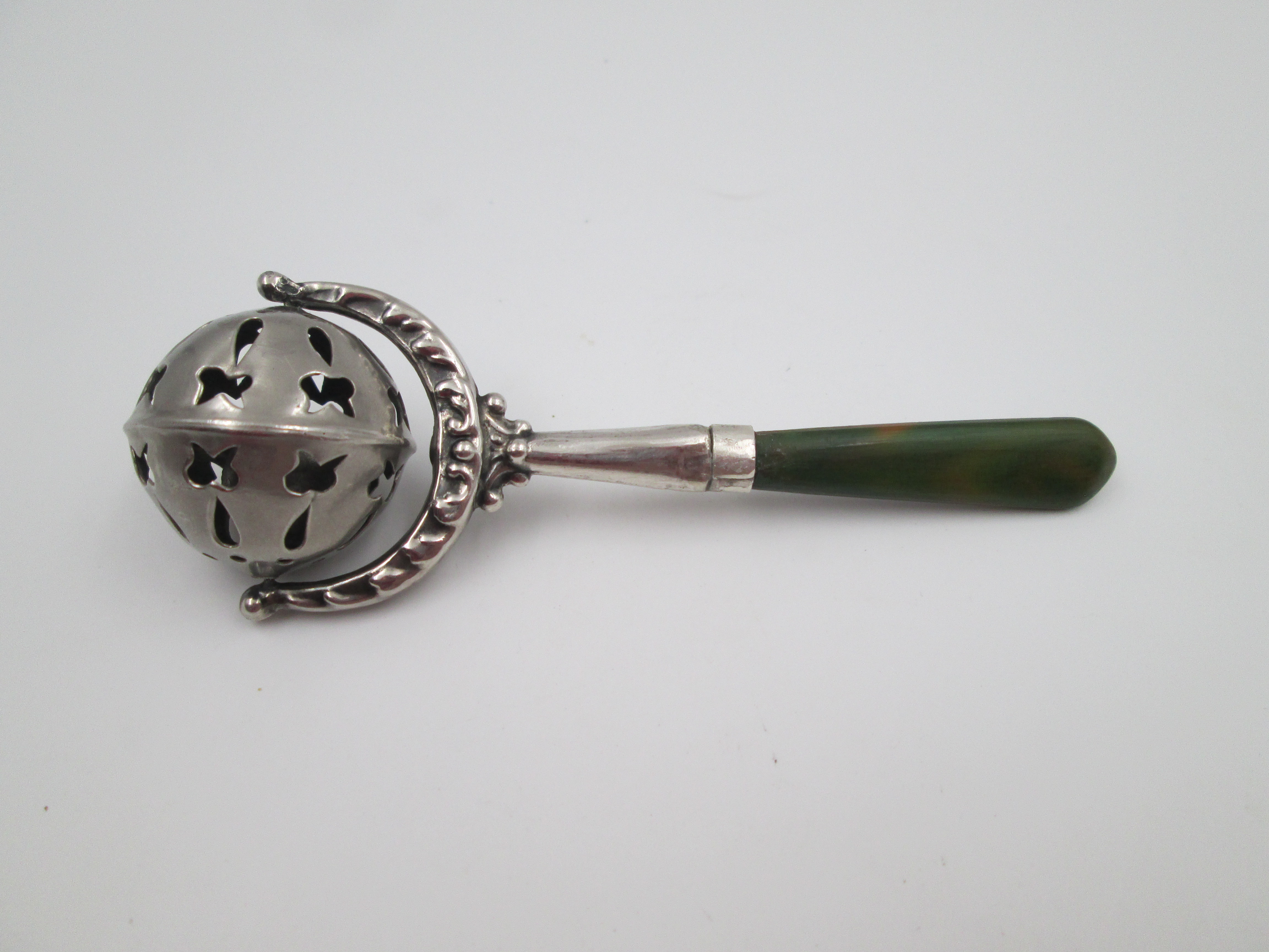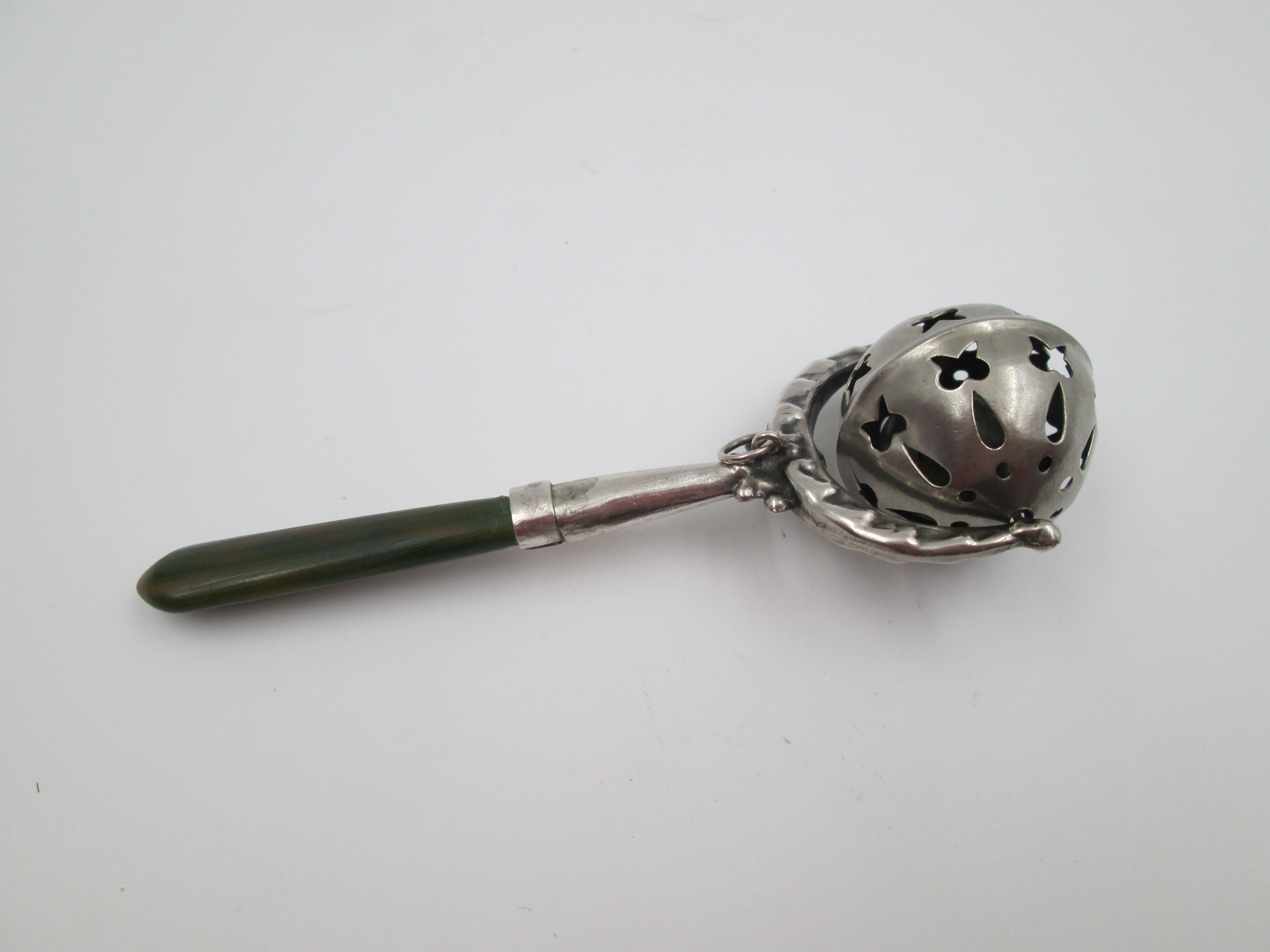 Baby rattle with handle. Sterling silver & bitone resin. Sphere with drops and butterflies