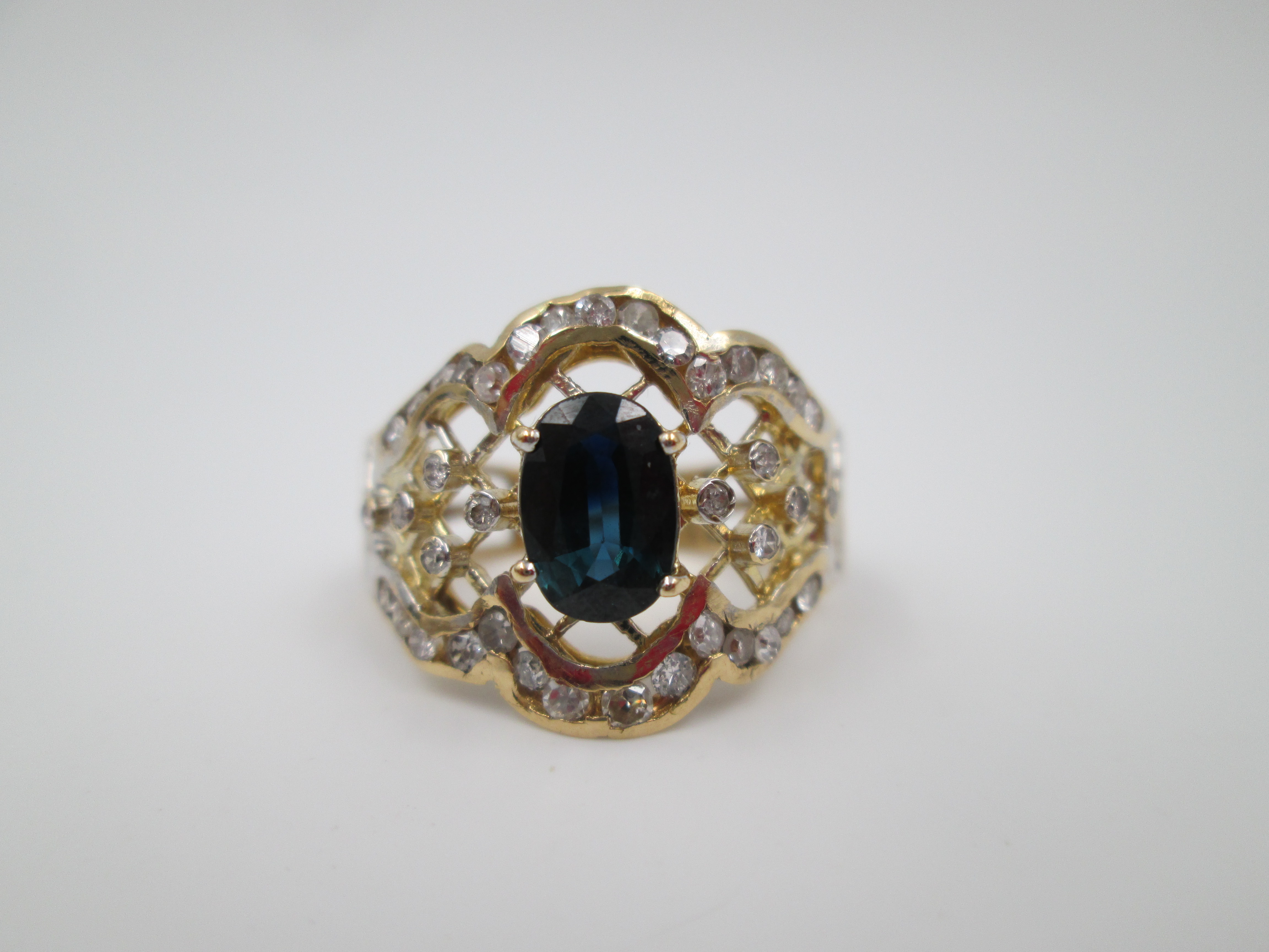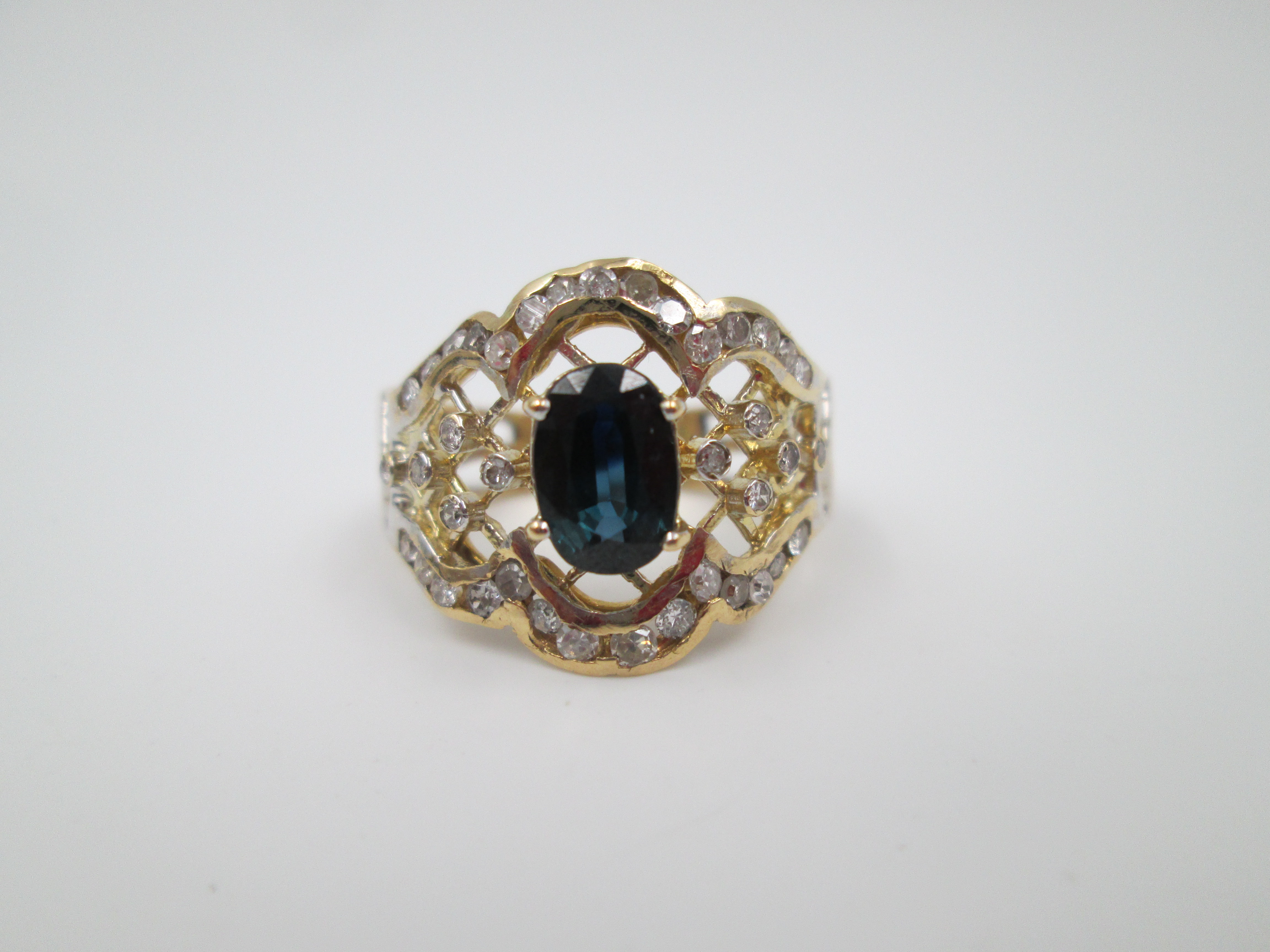 Women's openwork ring. 18 karat yellow gold, diamonds and sapphire. Europe